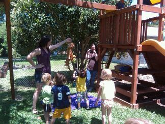 We had a busy weekend! Joshua went to his first non-family birthday party! At first, he didn't know what to think. There was so much to do that I think he got a little overwhelmed. When his friend, Andrew showed up, he got a little more comfortable and ventured away from our side. It was so cute because when Joshua showed up, Anna(the birthday girl) came up and said, "It's Joshua!" and gave him a big hug. It was adorable! They had a curious George pinata and the kids loved taking turns hitting it. Eventually, Anna's mom had to rip the pinata open for the candy to fall out! George is one tough monkey(ha!). While Joshua was there, I think he found a new love...the trampoline. It was a small one that had a bar to hold on to, kind of like an exercise one, but for kids. He jumped and jumped on that trampoline. The picture, right below is him trying to hit the pinata! He hit it pretty much every time! He didn't really care about the candy; he just wanted a chance to swing the bat! (Future baseball player, perhaps?)